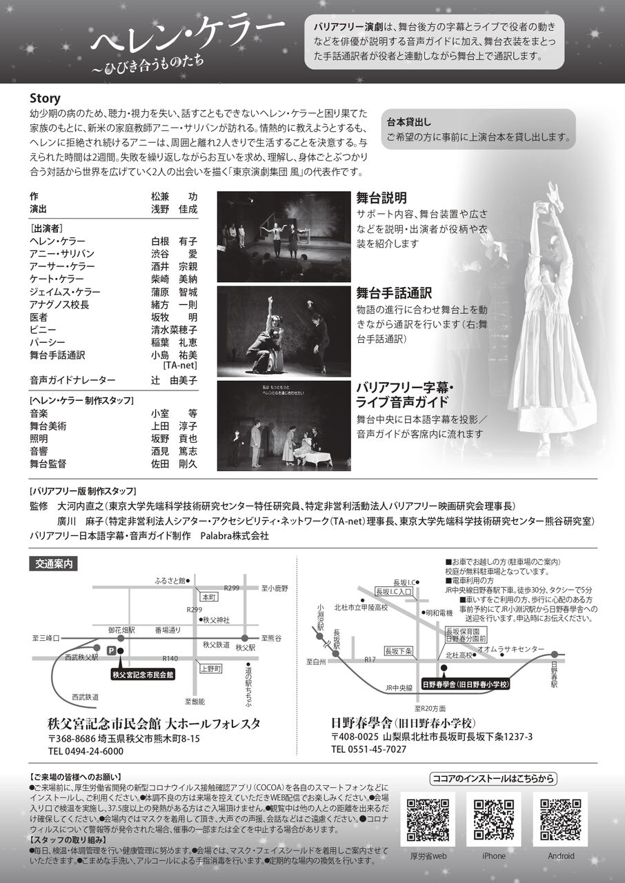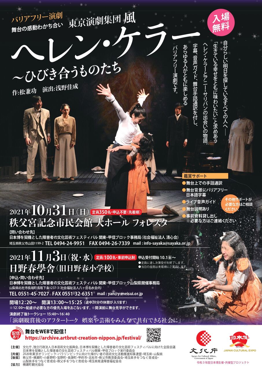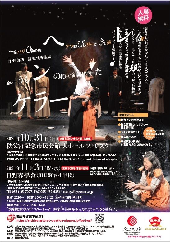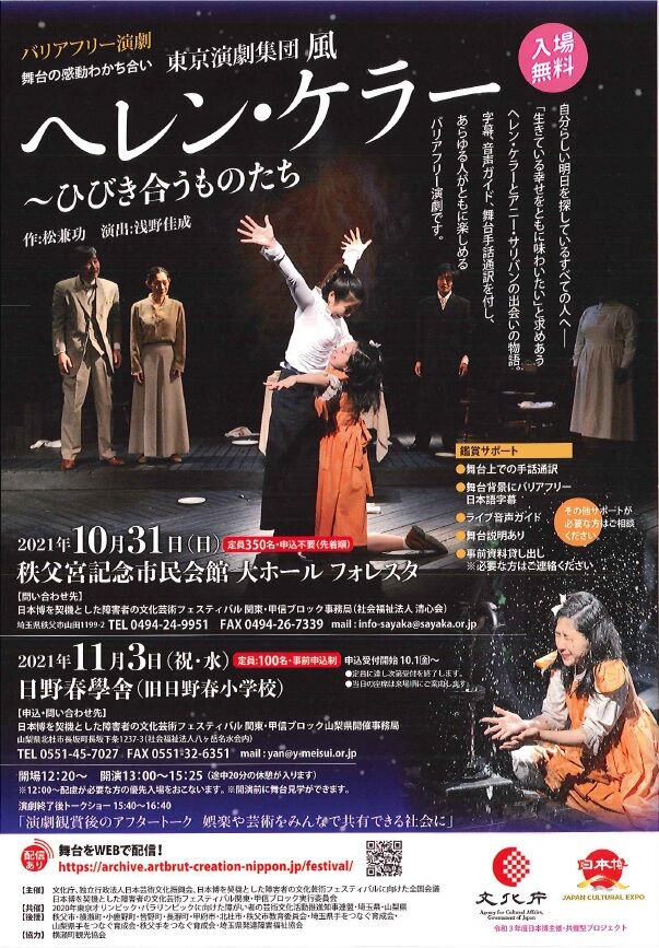 令和3年11月3日(祝・水)日野春學舎体育館にて、バリアフリー演劇「ヘレン・ケラー 〜ひびき合うものたち」公演を開催いたします。