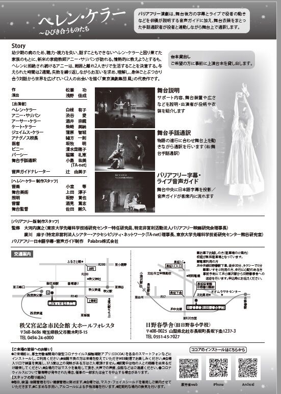 山梨県内では11月3日(祝・水)日野春學舎にてバリアフリー演劇「ヘレン・ケラー〜ひびき合うものたち」