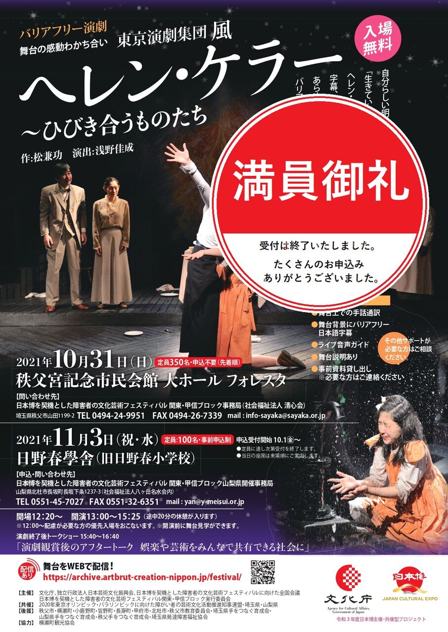 令和3年11月3日(祝・水)日野春學舎体育館にて開催するバリアフリー演劇「ヘレン・ケラー〜ひびき合うものたち」公演のお申込みは、定員に達しましたので受付を終了とさせていただきます。たくさんのお申込みをいただき有難うございました。