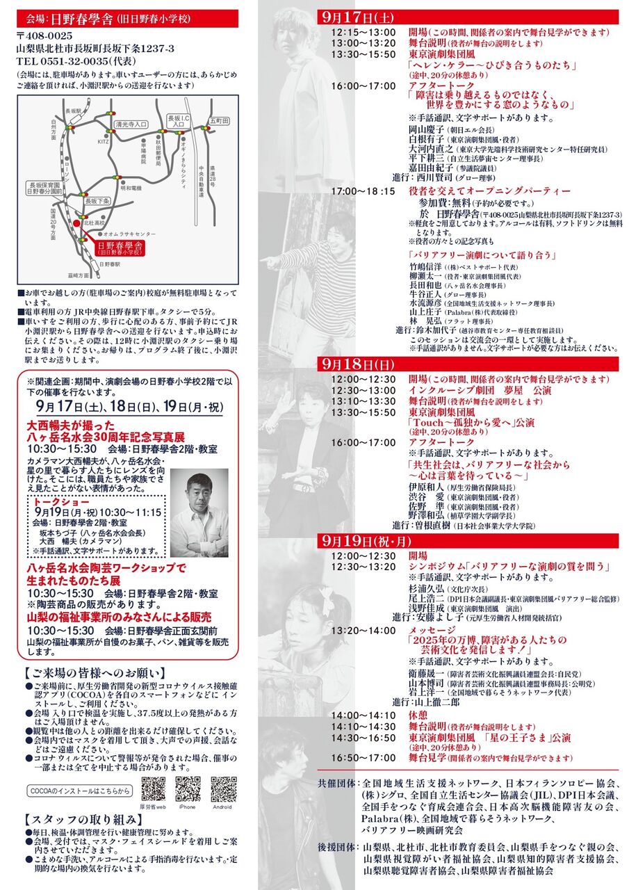 最後に、この演劇祭は、 障害や生きにくさを通路に、芸術の可能性を掘り起こす実験でもあります。東京演劇集団風と劇団夢屋とダンサナクセイバー、そして参加して頂ける皆さんとで一緒に作りあげる、山梨ブランドの「山梨県・みんなで楽しむバリアフリー演劇祭」で、お会いできたらと思います。