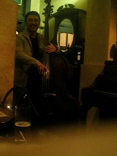 岡安&金子Duoをかぶりつきの席で堪能〜 此処の音響、なかなか良いなぁ〜 健ちゃんの生ベース、良い音だし〜 岡安さんの、微妙にフレットに当たる音も、心地良く聞こえる。今日はベースとトレブル0なんだって。