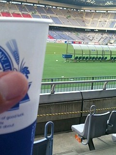 めちゃめちゃ良い席〜!!...芸能人探さなくちゃ〜!?って席だ。 既にビール3杯〜 ヘベレケ...只、スポンサーの関係で、バドワイザーしかないなんて!! ドイツだったら暴動が起きるっちゅーの!(怒)