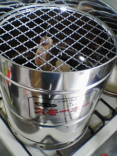 とりあえず、インターネットで作り方を確認して、下拵え〜! ...果たして、今夜美味しく食べられますか〜!? 只今スモーク中〜(o^∀^o)