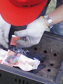 とりあえず、火を熾すのだが、なかなか着かず、「何か燃える紙ないか?」ということで、クルマに在った、先日買ったフラッシュ〜