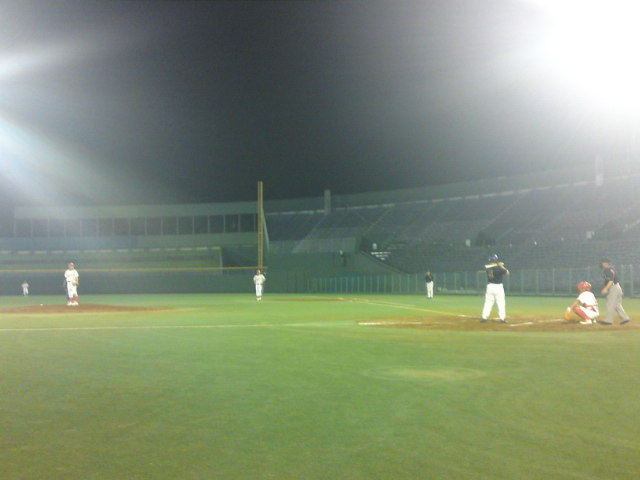 半ズボンで 素足 ・・・とてもソフトボールやりに来た格好じゃないオレが打席に入る