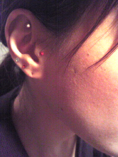 見えますか?赤とクリスタルを片耳に4つずつつけました。