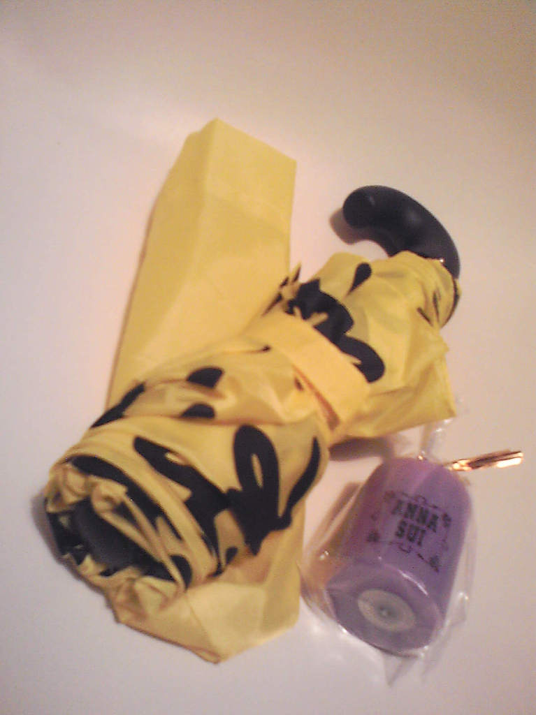 降りるときにこんな手土産をもらいましたよ!ANNA SUIのキャンドルとFOREVER 21の折りたたみ傘です