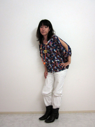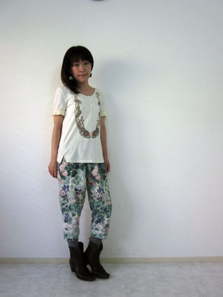 私の今日のコーディネートはエスニックなプルオーバーに花柄パンツ、貝殻のピアス、ブーツ。