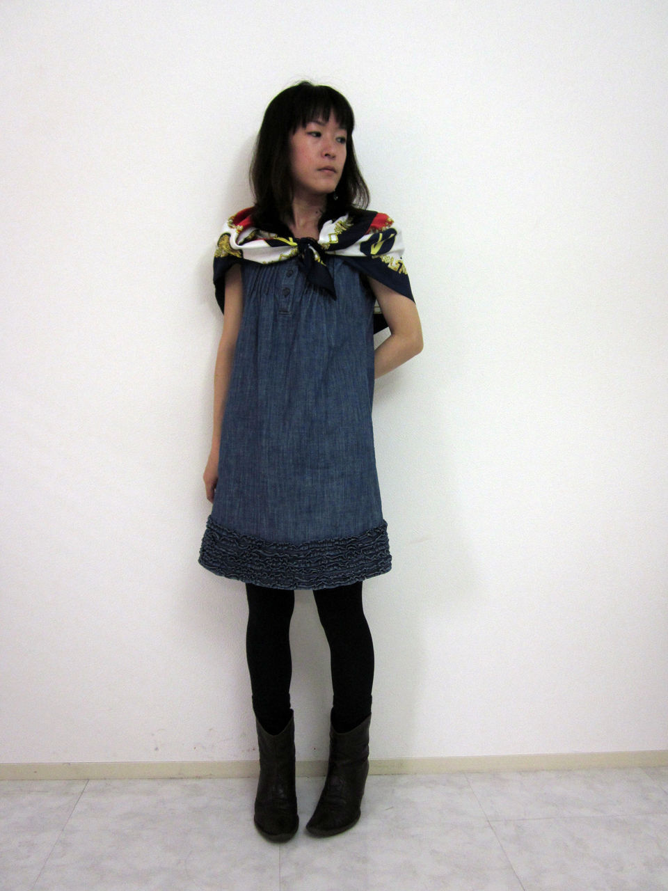 今日のコーディネートは、デニムワンピースにスカーフ。レギンス1枚、靴下4枚履いています。