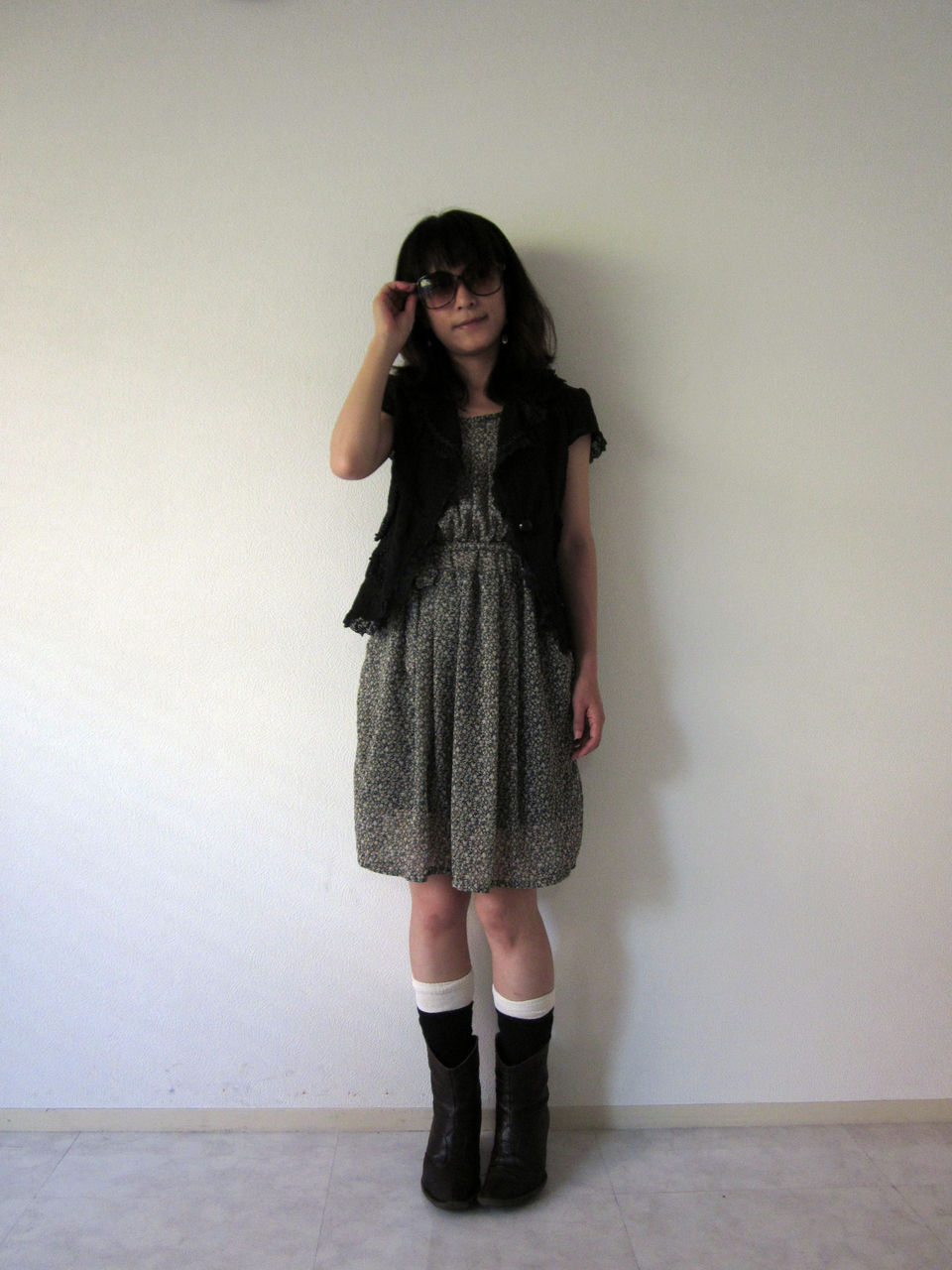 コーディネートは黒ジャケットにグリーンの小花柄ワンピース。靴下4枚にブーツです。この黒ジャケットはクロエのユーズドです。ビーズやフリルたっぷりなのですが、コンパクトで甘すぎないところがお気に入りポイントです☆
