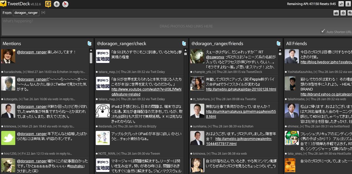 - 軽い気持ちで始めたTwitterでしたが、もはや「つぶやき」は生活の一部になってしまいました(2010年1月29日現在)。 で、これまた軽い気持ちで「TweetDeck」というTwitterクライアントを入れてみたところ・・・ 「Mensions」(自分宛てのRT、返信が見れるタイムライン)に...