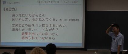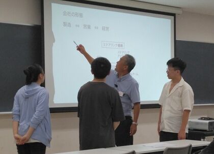 同じモノでも、(ボールペンを例にして)加工者にとっては " モノを見る " ことが当たり前なのが、営業職の方々はモノだけではなく " 相手の顔 " を見ながら話をすること、経営者は両者を俯瞰的に見ている等、立場が違えは考えていること見えていることが異なるということを学生を使って実体験してもらいました。モノを製造して売るという営業行為に対して会社組織としては同じ方向を向くためにも経営者が統率を取らないとならないとお話ししていただけました。[画像:20250918_02]