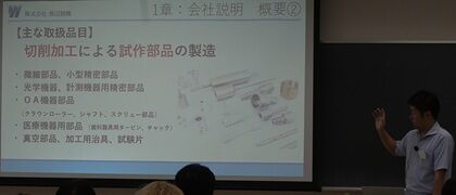 冒頭で会社の概要説明。業務としては「切削加工による試作部品の製造」で売り上げの大部分は試作部品だそうです。
