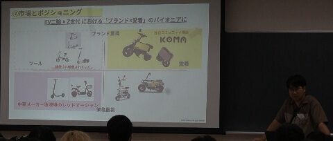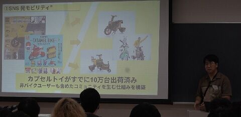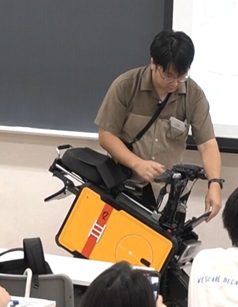 本日は雨の中自走して来校され、講演の部屋までバイクを搬入し、実際にたたまれた状態から組み立ての作業も実演していただけました。