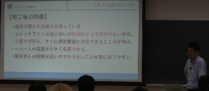 一人一人の裁量が大きくその分成長できる。経営者との距離が近いのでやりたいことを形にしやすいなどの特徴と後継者不足で廃業してく工場が増えている、廃業した会社の転注先が見つからないという問題があるという現状をはなしていただきました。