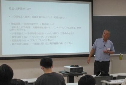 最後に「根っこが浅い木は倒れる」ということを話されました。先人たちは「生きたなりに人生観・世界観」があり、それを「ほどほどに先人たちの話を聞きなさい」「聞かないと損しますよ」と話され、「チャンスを見逃すことになりかねない」という話は学生も興味を持って聞いていたようです。