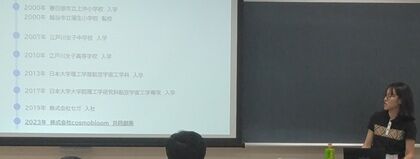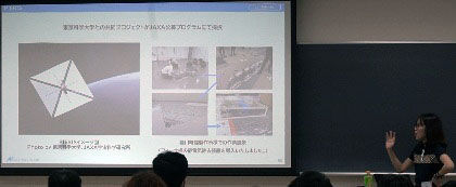 まずは自己紹介から。中学生のころ雑誌 " Newton " を買い与えられていたそうで、それを見て宇宙に興味を持っていたそうです。高校時代文系科目の成績があまりにも悪かったため、 " 理系クラス " に強制的に入れられたそう。さらに友人に付き合って日大のオープンキャンパス(航空宇宙)に参加、AO入試を経て無事入学。中学高校時代は何も勉強していなかったので、大学で一生分の勉強をするつもり(後日誤りに気付いたそうです)で1年生のころから研究室に顔を出し人工衛星の開発に携わる。大学院へ進学するのが当たり前の学科なので大学院進学。大学時代に開発をしていたので、大学院では研究成果を出すことに注力。うーん行動力が凄いですね。