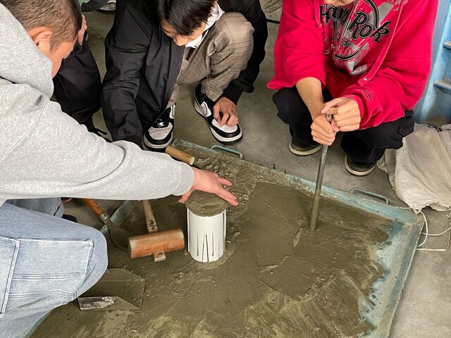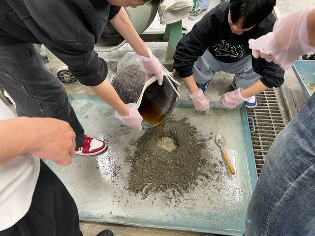 今回の授業ではみんなでコンクリートの材料を測り、手練りでコンクリートを練り、供試体を作製しました。