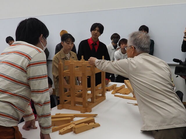 歴史的建造物や社寺建築を手掛ける専門会社である岩瀬建築有限会社の岩荑さんと大工さんを招いての授業です。歴史的建造物の修理過程や社寺建築のみかたに加え、木造の要の一つである継手・仕口についても学びました。
