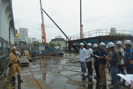 RIMG0007 建築学科 4年生が、建築工事現場の見学を行いました。現場では大別して3種の工事が同時進行している状況でした。1つは地下の根切り工事で、地面から8m下の土を搬出していました。その隣では、すでに地下1階まで掘られた部分に、大型クレーンで鉄骨の梁を架け渡す工事が行われており、さらに隣ではコンクリート躯体の鉄筋工事が見られました。このように大規模な工事現場では、工区を分けて様々な作業が行われることがあります。学生も現場監督の説明と眼前の作業とを、交互に見聞きしながら学んでいました。(担当:赤石)