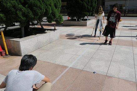 閉合トラバース トランシットを用いて閉合トラバースの測量実習を行いました。この日の前日に梅雨明け宣言があり、強い日照りの下での実習になったので、30分ごとに休憩を取りながら作業を進めました。指定された図形を、床面に養生テープを貼りながら正確に作図します。最後には元の出発点に戻るのですが、なかなか精度のよいデータが取れずに再計測をするグループが続出しました。その分、だんだんと測量機械がうまく扱えるようになったようです。