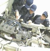 1年シャシの実習でトランスミッションを降ろす前にどこに、ボルトが有るか見ている風景です。