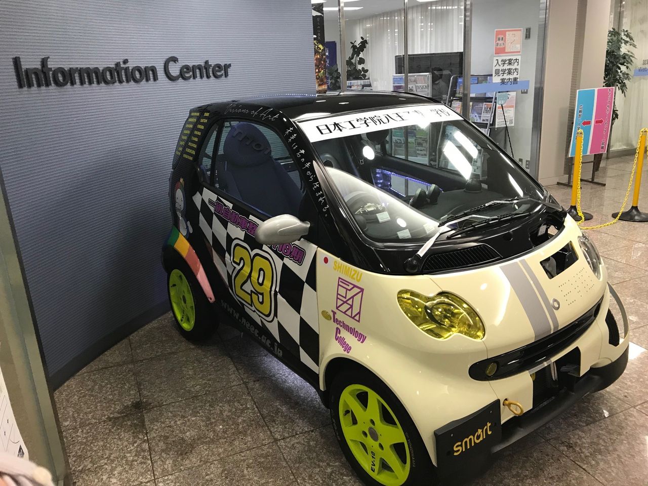 自動ドアをくぐるとドーンとスマートがお出迎えをします。向かって右はクルマの内部が見えるカットモデルに!向かって左は学生デザインによるレーシーなラッピング!そしてもちろん我が日本工学院八王子専門学校のゆるキャラ「ぱっちい」が更に皆さんをお出迎えします!