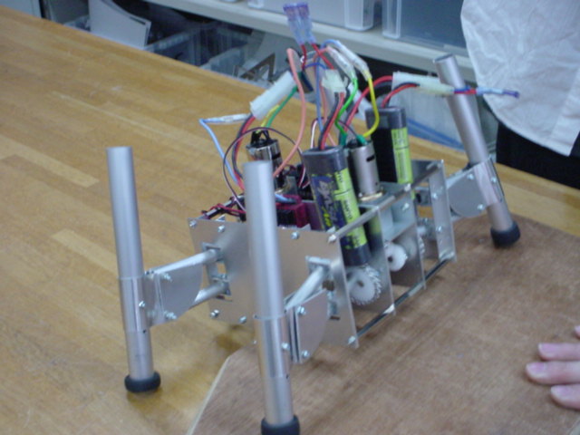 ユニバーサルジョイントのロボットです。本日は、段差に挑戦しているようです。段を上るためには、足が充分に高く上がっていないと出来ませんね。学科で出場予定の「かわさきのロボット競技大会」ではこのような段差のあるコースでレスリングを行います。