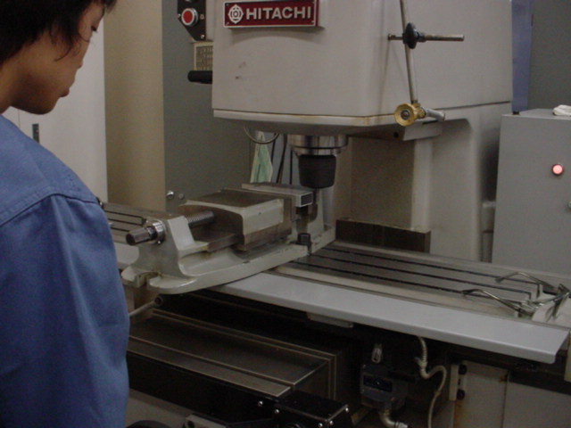 学科プロジェクトの部屋には専用の工作機械があって、精度の高い加工をおこないます。写真はフライス盤をつかった加工の様子です。