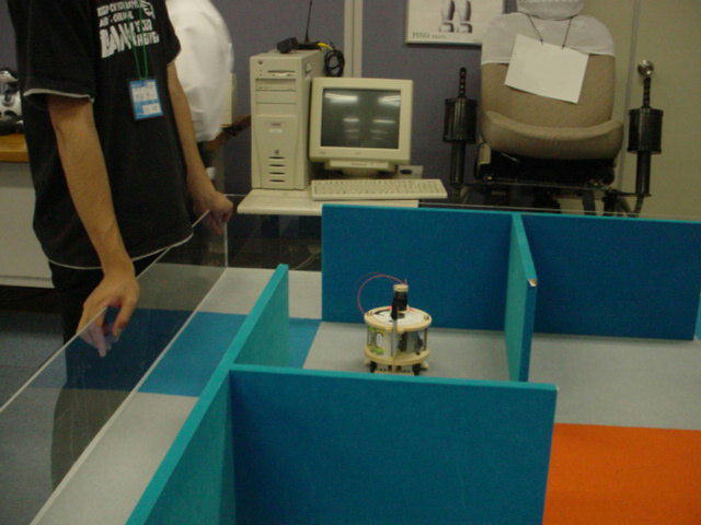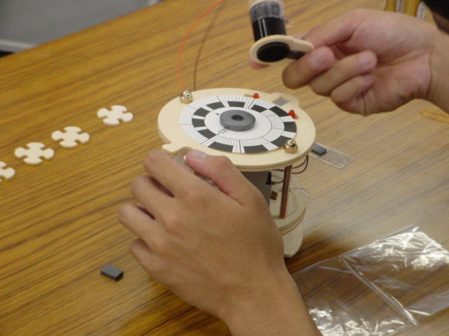 DR-01は、光センサを使って、紙製の円盤から黒白情報を読みとってモーターを動かします。写真のように迷路脱出のプログラムを組むことも可能です。