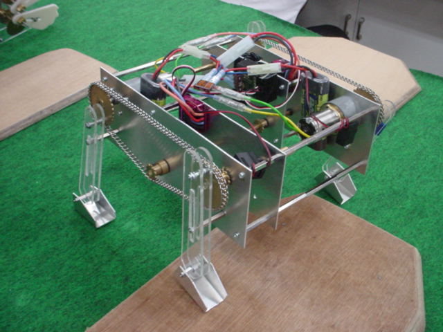 左右独立の駆動です。前足と、後ろ足はラダーチェーンとスプロケットでシンクロしてますね。かなり、ユーモラスな動きですね。