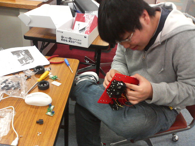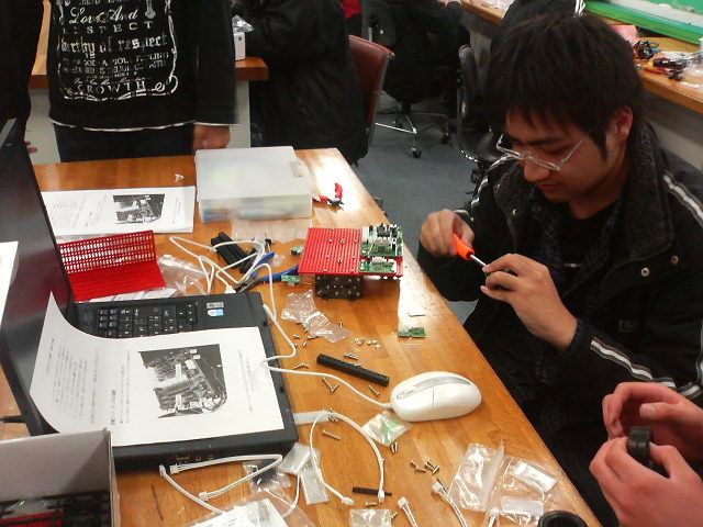 この実習では2人一組になって、まず1台のロボットを組み立てます。