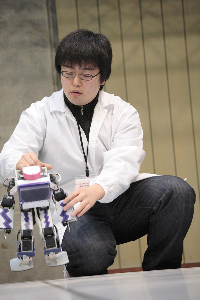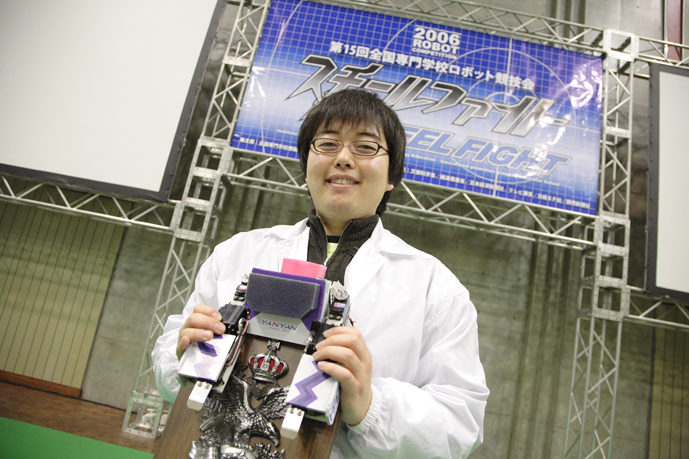 製作者は、当時ロボット科2年生の井伊 祐介くんですなかなか爽やかな笑顔で写ってますねえ井伊くんは今年の3月にロボット科を卒業して、めでたく姉妹校の東京工科大学バイオニクス科の3年次に編入しましたおめでとー