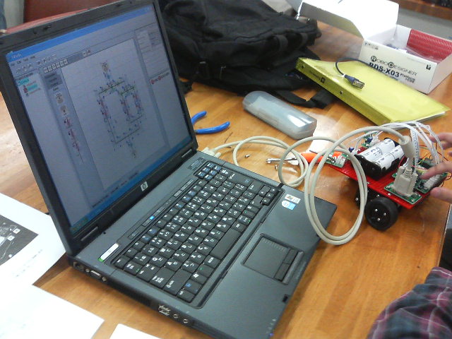 ロボデザイナー付属のソフトは、パソコンの画面でブロックを並べていくだけで簡単にプログラムが出来てしまいます実習の後半ではC言語でプログラムを開発します