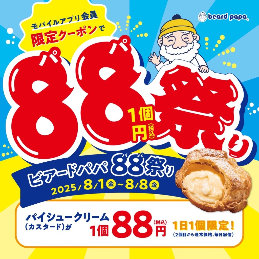 ビアードパパ、税込88円で「シュークリーム」を販売する『ビアードパパ88祭り』開催/8月1日〜8月8日
