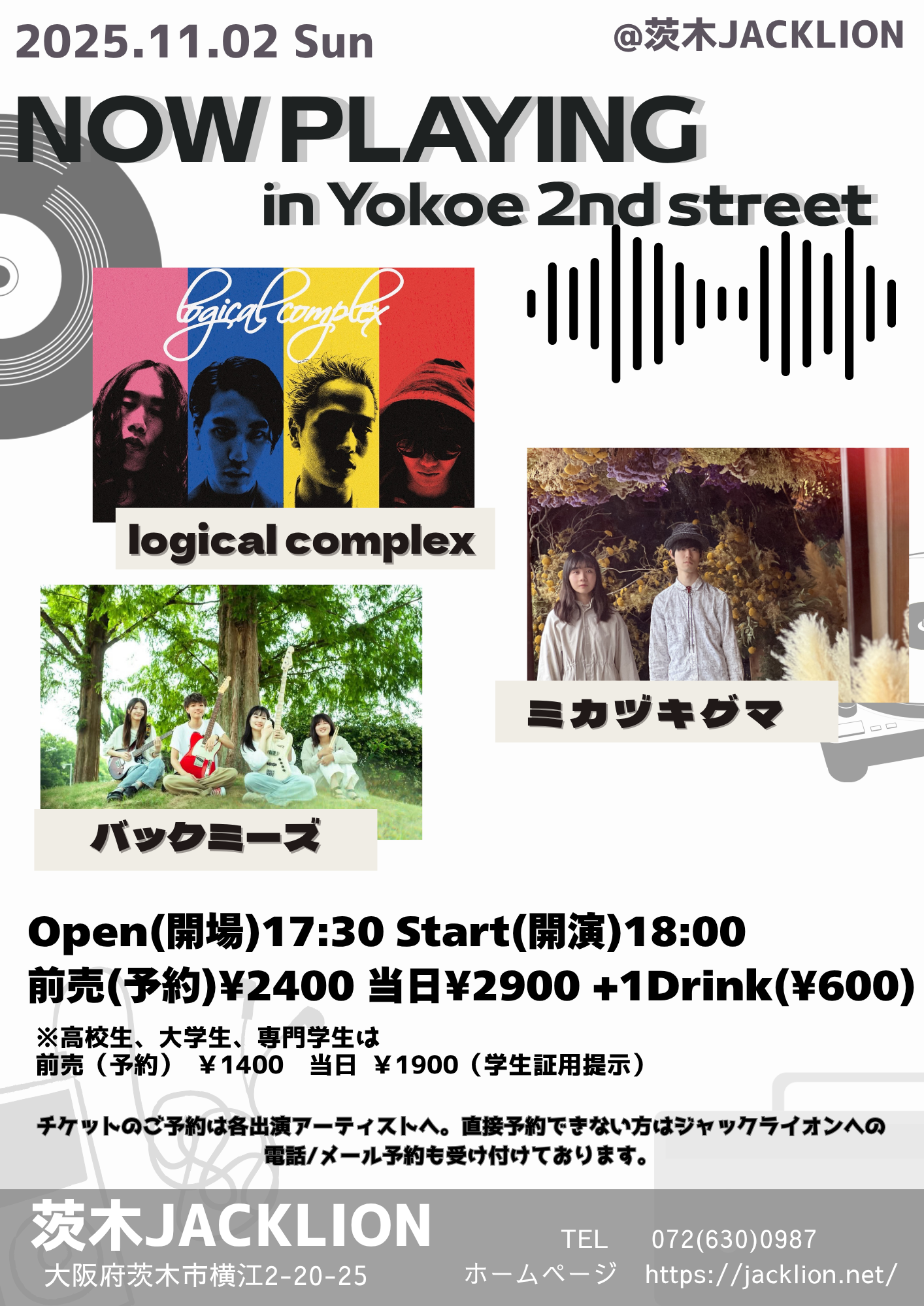 また、各出演アーティストへの取り置きが指定されてるライブで直接連絡が不可能な方は、ジャックライオンへのお電話 またはメールにて予約を承ります。詳しくは