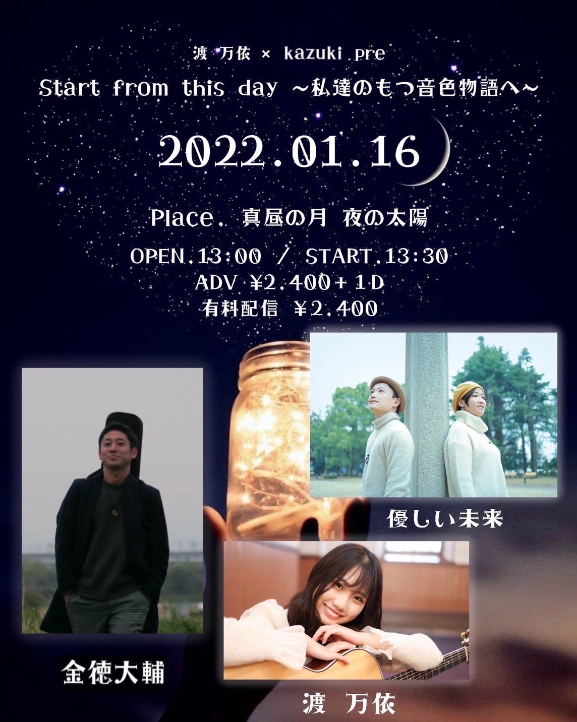 open/start 13:00/13:30(13:25頃配信start) 前売/当日 2400円(ドリンク代別) プレミア配信ticket:2400円