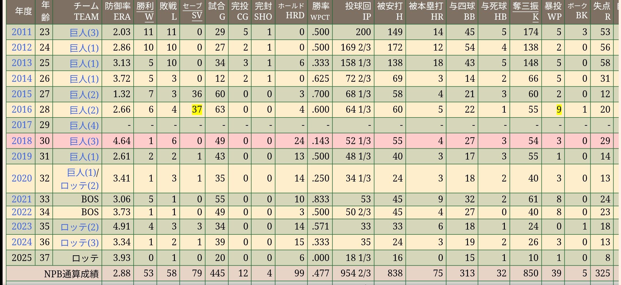 澤村拓一(23) 29先発 200回 11勝11敗 防2.03 174奪三振 WHIP0.97 QS率86.2% 被打率.210 2025年10月09日 カテゴリ:読売ジャイアンツ 千葉ロッテマリーンズ WS006929 1: 名無しさん 2025年10月09日(木) 21:16:02.662 ID:7LTBoN2r8 23歳 29登板 200回 11勝11敗 2.0324歳 26登板 169回 10勝10敗 2.8625歳 34登板 158回 5勝10敗 3.13 26歳 12登板 72.2回 5勝3敗 3.7227歳 60登板 68.1回 7勝3敗 1.32 36S 3H28歳 63登板 64.1回 6勝4敗 2.66 37S 4H29歳 0登板30歳 49登板 52.1回 1勝6敗 4.64 24H31歳 43登板 48.1回 2勝2敗 2.61 1S 13Hno title 【澤村拓一(23) 29先発 200回 11勝11敗 防2.03 174奪三振 WHIP0.97 QS率86.2% 被打率.210】の続きを読む タグ :#澤村拓一