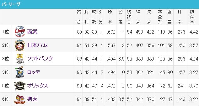 7/31 パ・リーグ順位表!ロッテ3連敗でSBと共に借金1の3位、好調西武と楽天は勢い止まらず