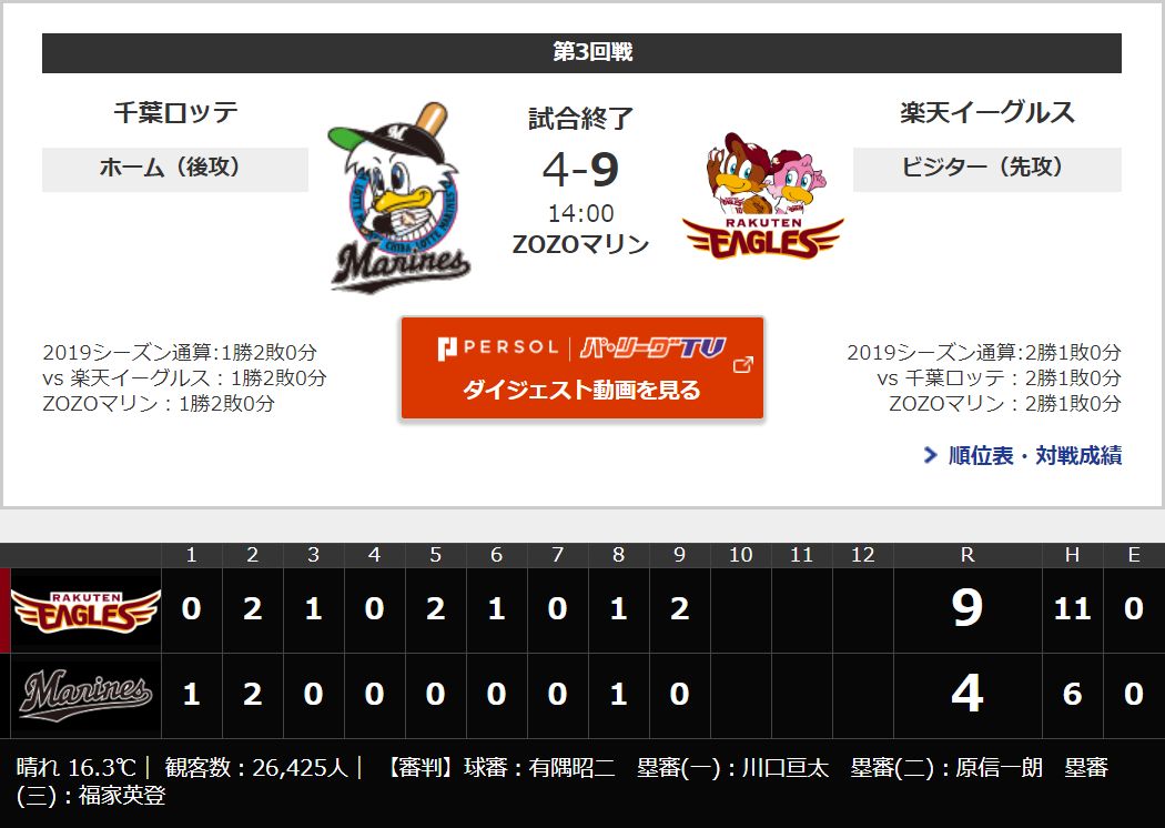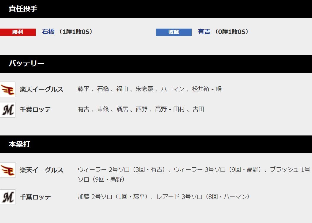 3月31日 ロッテ4-9楽天 レアードに3試合連続弾が飛び出すも投手陣のが安定せず...連敗を喫し開幕カード負け越し 2019年03月31日 カテゴリ:千葉ロッテマリーンズ 試合結果 bandicam 2019年03月31日 17-54-17-710 1: 風吹けば名無し 2019年03月31日(日) 17:53:17.29 ID:jvdpQ+bB0 はい WS000003 WS000004 WS000005 WS000006 WS000007 WS000008 WS000009 WS000010 https://www.marines.co.jp/gamelive/result/2019033101/ 【3月31日 ロッテ4-9楽天 レアードに3試合連続弾が飛び出すも投手陣のが安定せず...連敗を喫し開幕カード負け越し】の続きを読む タグ :#ロッテ #楽天 #試合結果