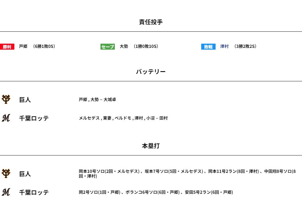 5月31日 ロッテ4-7巨人 先発メルセデスが5回4失点、打線は3本塁打が飛び出すなど一時同点に追いつくも澤村が被弾許し敗戦 2023年05月31日 カテゴリ:千葉ロッテマリーンズ 試合結果 bandicam 2023年05月31日 20-12-17-277.mp4_001513666 1: それでも動く名無し 2023年05月31日(水) 20:37:01.95 ID:pmfDDJpV0 負:澤村 本:ポランコ(6号ソロ) ポランコに一発浴びたけどロッテの勝ちや! ※(注記)GIF画像 WS003432 WS003433 WS003434 WS003435 WS003436 WS003437 WS003438 WS003439 [フレーム] 【5月31日 ロッテ4-7巨人 先発メルセデスが5回4失点、打線は3本塁打が飛び出すなど一時同点に追いつくも澤村が被弾許し敗戦】の続きを読む タグ :#ロッテ #巨人 #試合結果 #chibalotte #交流戦