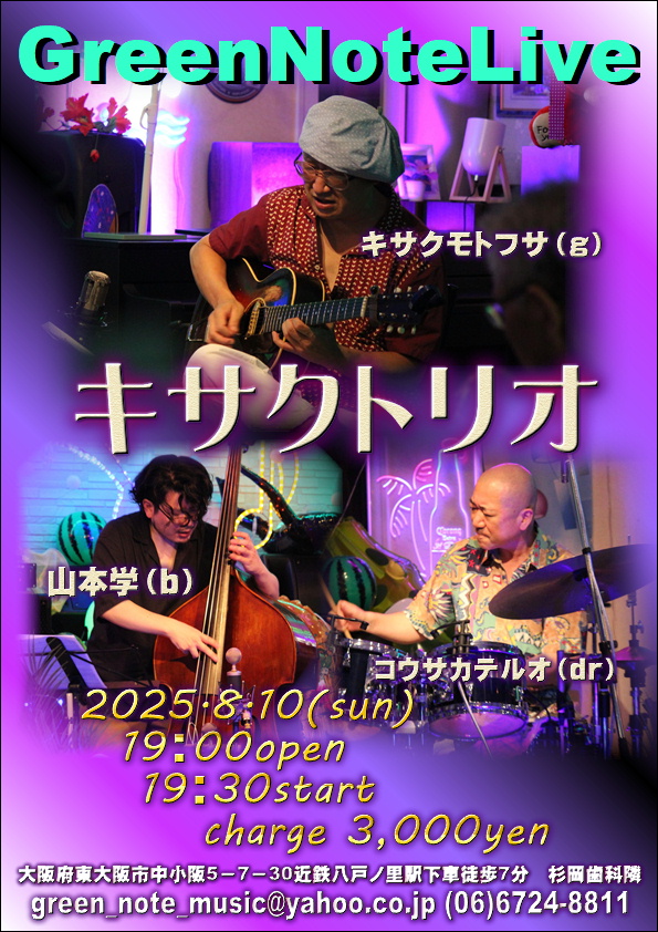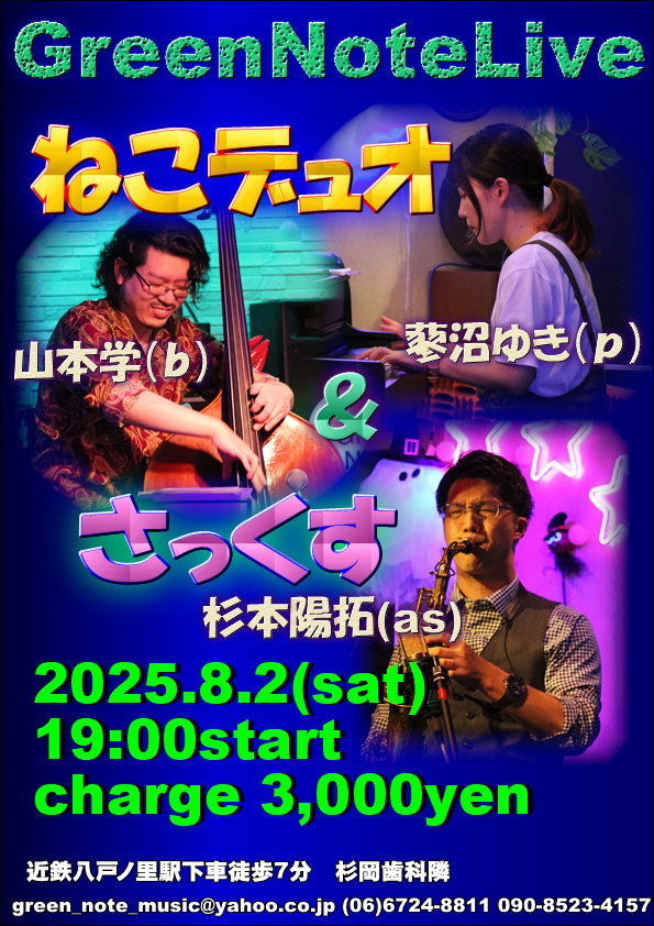 ねこデュオ&サックス2025年8月2日.JPG キサクトリオ2025年8月10日.JPG TRATTRIO2025.8.16.JPG 橋本有津子トリオ2025年8月24日.JPG Black Candy2025.8.30.JPG