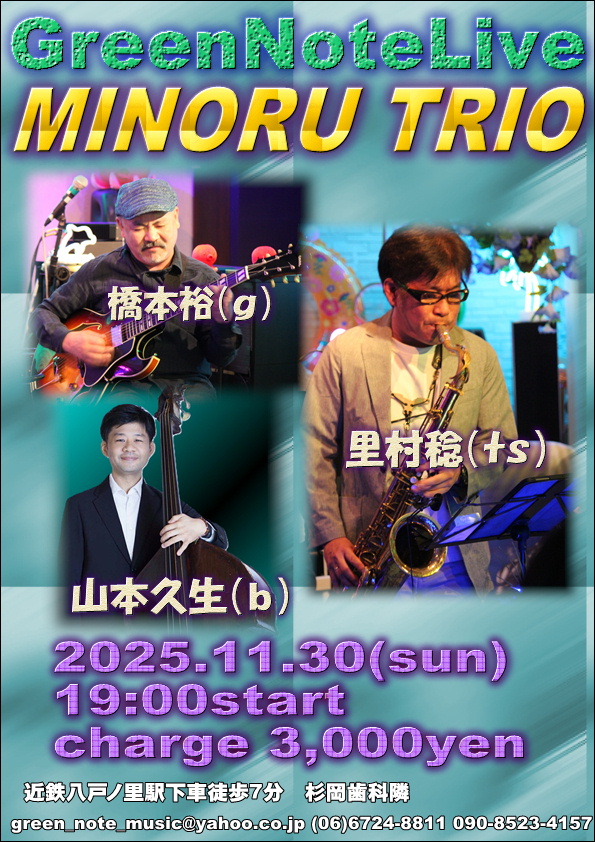 橋本有津子トリオ2025年11月9日.JPG TRATTRIO2025.11.15.JPG サックスコードレストリオ コウサカテルオ、山本学、杉本2025年11月29日.JPG MINORU TRIO 2025年11月30日.JPG