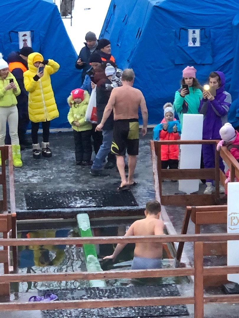 それを記念して、ロシアではこの日、全国各地で、ロシア正教徒が屋外の冷水で沐浴する習慣があります。聖職者が清めた水は無病息災につながるということで、信者は身を清めて自らの健康を祈ります。