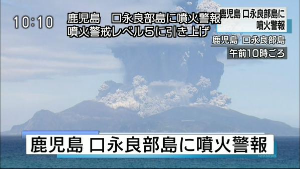 29日午前9時59分ごろ、鹿児島県の口永良部島で爆発的噴火が発生した。気象庁は、噴火警報を発表し、噴火警戒レベルを3(入山規制)から5(避難)に引き上げた。