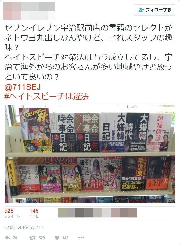 セブン-イレブンのある店舗は、「ヘイト本ばかりを置いている」と、ヘイトスピーチ問題への抗議活動を展開する人々から批判を受けていた。店内の書籍コーナーを撮影した画像も、Twitterに出回った。