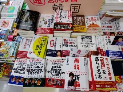 難民を描いたイラストをめぐって論争に発展した『そうだ難民しよう!』、題名に「嫌韓」が含まれる各種の書籍等が、棚に並んでいる。「書籍のセレクトがネトウヨ丸出しなんやけど、これスタッフの趣味?」とツイートした人物は疑問視した。