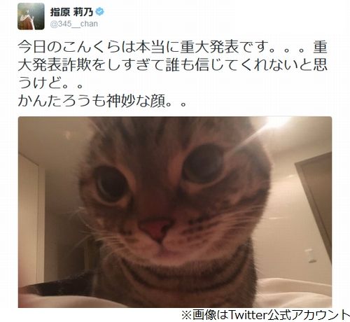 指原はこの日、「今日のこんくらは本当に重大発表です。。。重大発表詐欺をしすぎて誰も信じてくれないと思うけど。。」とツイート。飼い猫の写真を添え、「かんたろうも神妙な顔。。」と続けている。