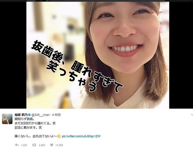 そして、5月7日に経過報告をし「親知らず抜歯。 まだ3日目だから腫れてる。笑 記念に載せます。笑 痛くないし、血も出てないよ〜」と腫れている顔の写真をツイッターで公開している。