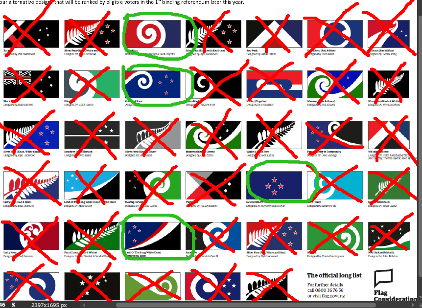 スレッド「国民投票用のニュージーランド新国旗候補」より。2016年の国民投票でニュージーランドの新国旗に変更するかどうか決定する。これに伴い、新国旗の候補も公募で集められ、現在40デザインまで絞られたという。(※(注記)何行目の何列目などの書き込みがわかりにくかったので画像を抜き出し追加して反応をまとめました。)